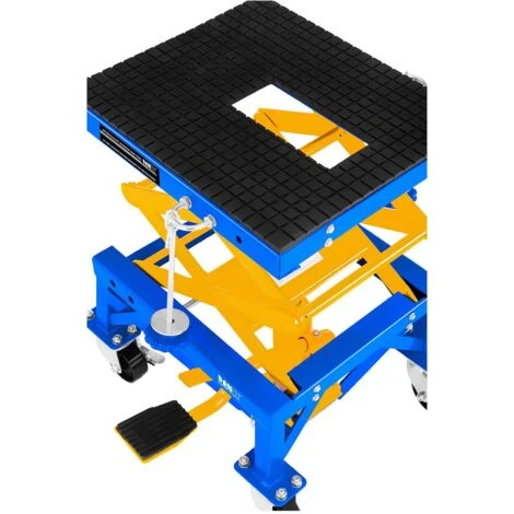 Il sollevamento e l’abbassamento vengono attivati per mezzo del pedale. La piattaforma può raggiungere un’altezza compresa tra 35 e 87 cm. Una volta scelta l’altezza desiderata è possibile bloccare il cavalletto con un’asta. Questa caratteristica rende il prodotto che ti offriamo ancora più sicuro. Per via del suo impiego intuitivo e della sua compatta costruzione il cavalletto non è adatto solo per sollevare motociclette ma anche altri tipi di carichi fino a 135 kg.