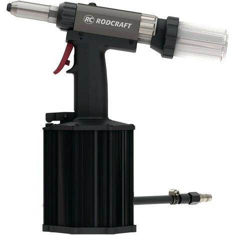 per rivetti standard in metalli come rame, alluminio, acciaio e acciaio inossidabile, (BULB-TITE fino a 7,8 mm) · Contenitore di raccolta per mandrini rivetti strappati · Funzione vuoto: tiene il rivetto nel cono prima di premere il pulsante di scatto (ideale per lavori verticali) · Maniglia composita · 5 bocchini diversi · Collegamento aria con possibilità di rotazione a 360° Ulteriori caratteristiche tecniche: · Filettatura di collegamento: 6,3 mm (1/4′) IG · Peso: 2,46kg · Pressione di esercizio: 6.3bar. Corsa: 27 mm, Forza di trazione: 21000 N, Consumo aria: 34 l/min, Rivetto Ø: 4.8-7.8 mm, Marca: RODCRAFT