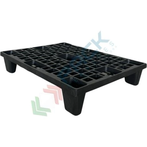 Bancale in plastica riciclata (PP), Mis. 600 L x 800 P x 140 H mm, base di appoggio 5 piedi, portata dinamica 500 Kg, portata statica 1100 Kg, piano superiore forato. Pallet in plastica leggera, inseribile per un risparmio notevole di spazio, soprattutto in fase di stoccaggio, con elevata capacità di carico. Non richiede alcuna manutenzione particolare, esente da danneggiamento per intemperie ed umidità, resistente alle alte e basse temperature. Il bancale di plastica è maneggevole, può essere inforcato da tutti e 4 i lati con traspallet o carrello elevatore. Colore grigio/nero. Pallet plastica NON idoneo al contatto alimentare.