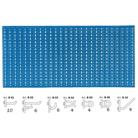 Pratico pannello con fori su tutta la superficie per poter inserire i ganci a proprio piacimento per poterci appendere giraviti, chiavi, forbici martelli ecc.