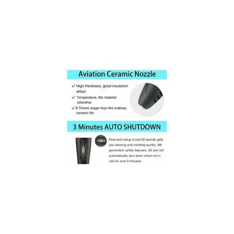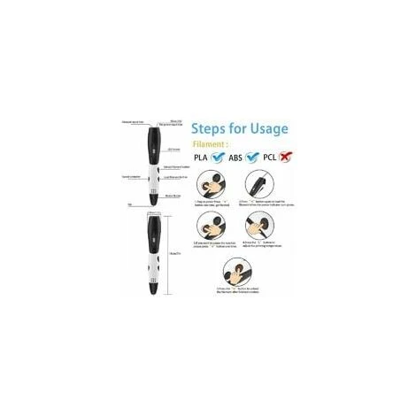 【Per bambini sopra i cinque anni sotto controllo】 Perché la temperatura di fusione dei filamenti varia da 180 a 200°C, il che può renderlo fonte di pericolo. Devi quindi stare molto attento a non scottarti. L’ugello e i filamenti possono diventare estremamente caldi. La penna per stampante 3D è adatta per bambini di età superiore ai cinque anni sotto supervisione e per adulti creativi. Dati tecnici: