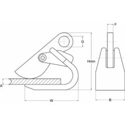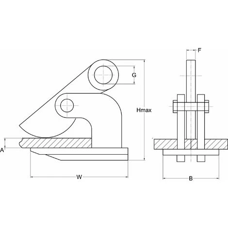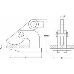 | WLL (t) | Blechdicke A (mm) | H (mm) | W (mm) | B (mm) | G (mm) | F (mm) | Gewicht (kg/szt) | ||