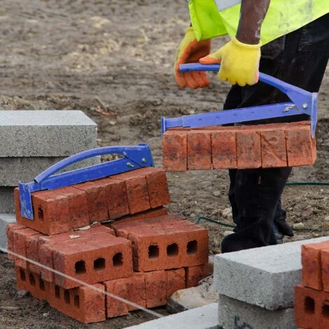 Il sollevatore, realizzato in acciaio resistente e rivestito di uno strato di vernice protettiva, consente di afferrare più blocchi contemporaneamente e di trasportarli in sicurezza. Dopo aver posizionato la quantità desiderata tra le ganasce, al sollevamento della pinza, i mattoni vengono incastrati dalla ganascia mobile. Possono quindi essere trasportati in modo sicuro, comodo e senza grandi sforzi.