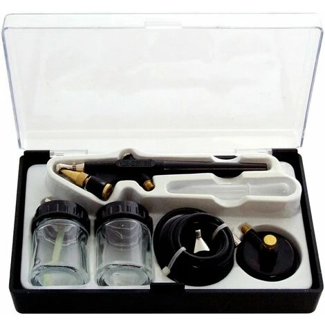 Pistola Aeropenna Aerografo Kit professionale airbrush doppia azione pitturaPISTOLA AEROGRAFO PER HOBBISTICA Kit Professionale di Aerografo per realizzare modelli artistici, Ricostruzioni Unghie, Una neccessità per un lavoro particolare come design automobili, realizzare modelli artistici, grafici, ecc. Ideale per vari lavori creativi come Dipinto di Modelli, Arte del Corpo, Belle Arti, Dipinti di Macchina, Fotoritocco, Illustrazioni, Tessili e Dipinto di Magliette Colore: Nero Lunghezza del tubo d’aria: 170cm circa Pressione di funziona: 15 – 50 psi Come si usa1. Collega il regolatore d’aria col raccordo2. Collega il regolatore d’aria col serbatoio, e collega l’altra fine del raccordo coll’aerografo a penna, girando in senso orario per fissarlo3. Accende aria da girare la manopola in senso orario fino a ricevere la pressione richiesta4. Regola il flusso di vernice con girare il tappo del fluido nella parte anteriore dell’aerografo. Contenuto della confezione1 x Aerografo1 x Tubo PU2 x Serbatoio di vetro1 x Copertino1 x Raccordo1 x Contagocce1 x Regolatore