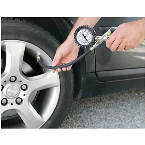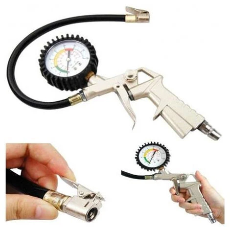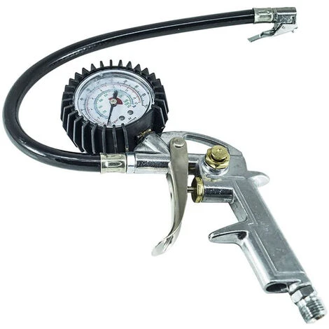 Pistola con manometro adatto per il gonfiaggio-sgonfiaggio o rilevare la pressione delle gomme auto,moto,furgone,camper ecc. Ideale per tutti i compressori, ha una struttura in alluminio e una protezione in gomma per il manometro.