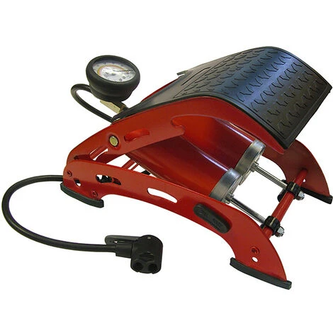 Corpo robusto in acciaio con piedini in gomma. Ampio pedale ergonomico ricoperto da una suola antiscivolo. Inflazione rapida. Manometro lettura in PSI e in Bar. Fornito con bocchette di gonfiaggio per pneumatici di auto e biciclette, palloni, materassini, gommoni, ecc. Tubo flessibile in gomma da 60 cm.