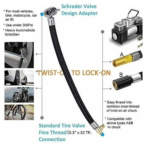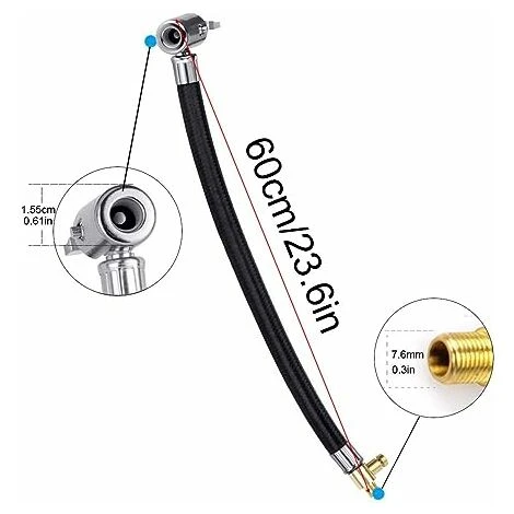 【Resistente e flessibile】 L’estensore della valvola del pneumatico è realizzato in metallo e gomma di alta qualità, robusto e durevole. Non è facilmente danneggiato e invecchiato, ha una qualità affidabile e una lunga durata. Facile da trasportare, per molti tipi di pompe.【Gonfiato rapidamente】 Questo estensore della valvola può estendere la lunghezza della valvola, consentendoti di gonfiare il pneumatico in modo rapido e sicuro. Allo stesso tempo, ha la funzione di sgonfiaggio. 【Resistenza ad alta pressione】 Adottare un tubo esterno intrecciato resistente ad alta pressione, forte e durevole, in grado di resistere a pressioni fino a 300 psi. È meglio di un connettore a vite o svitato in modo che non vi siano perdite d’aria durante la rimozione del tubo di gonfiaggio. 【Ampia applicazione】 Il nostro tubo di gonfiaggio per pneumatici per auto è molto versatile e può essere collegato direttamente al tubo della pompa. Non viene utilizzato solo per gonfiare le gomme di varie biciclette, motocicli, automobili, autobus, camion, sedie a rotelle, ma anche per collegare il gonfiatore e il compressore. 【Facile da installare】 Avvitare un’estremità al tubo di gonfiaggio, fissare l’altra estremità ai mandrini dell’aria della valvola del pneumatico e avviare il gonfiatore per completare il gonfiaggio dell’aria di scarico, basta avvitare l’ugello dell’aria al connettore a vite della pompa.