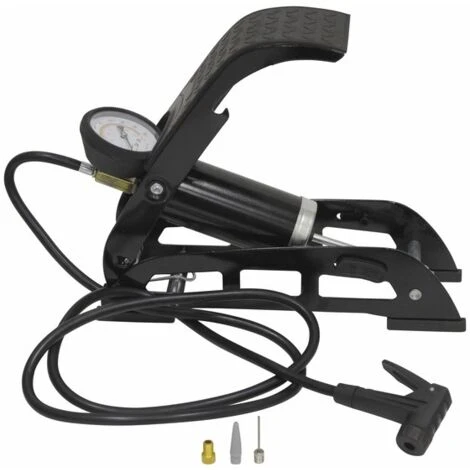 Pompa a pedale con manometro da 0 a 7 bar graduato in PSI, kg/cm2, kPa, bar Consegnata con flessibile lunghezza 1,5m Raccordo inseribile Pedale antiscivolo