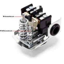 Pressostato a corrente alternata per pompe d’acqua, preferibilmente per elettropompe con serbatoio a pressione. La pressione di avvio e quella di arresto sono regolabili in continuo.