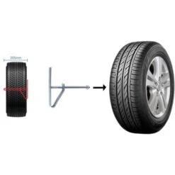 Sulla parete gli pneumatici sono ben ordinati. Su ogni supporto si adatta uno pneumatico. Adatto per pneumatici di auto, camper e roulotte. Lo pneumatico si blocca in modo sicuro fino alla successiva sostituzione degli pneumatici. Ideal per cantina e garage. Testo tradotto automaticamente