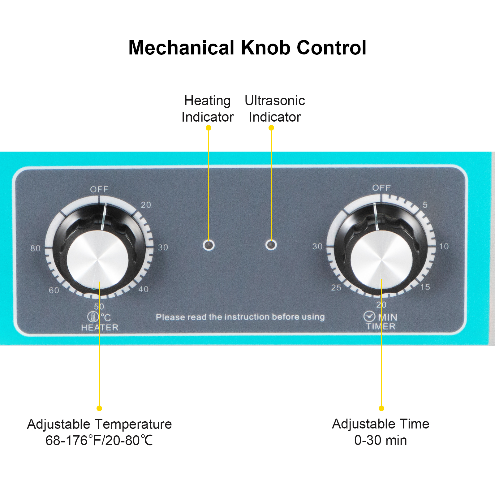Tempo di lavoro effettivo di pulizia di 180 W ( 0-30 minuti regolabili); Inoltre può riscaldare il liquido tra 20-80 (regolabile). Macchina controllata da micro-chip, con 2 manopole meccaniche per regolare le funzioni. Ottieni nuovi oggetti di valore dopo aver finito.