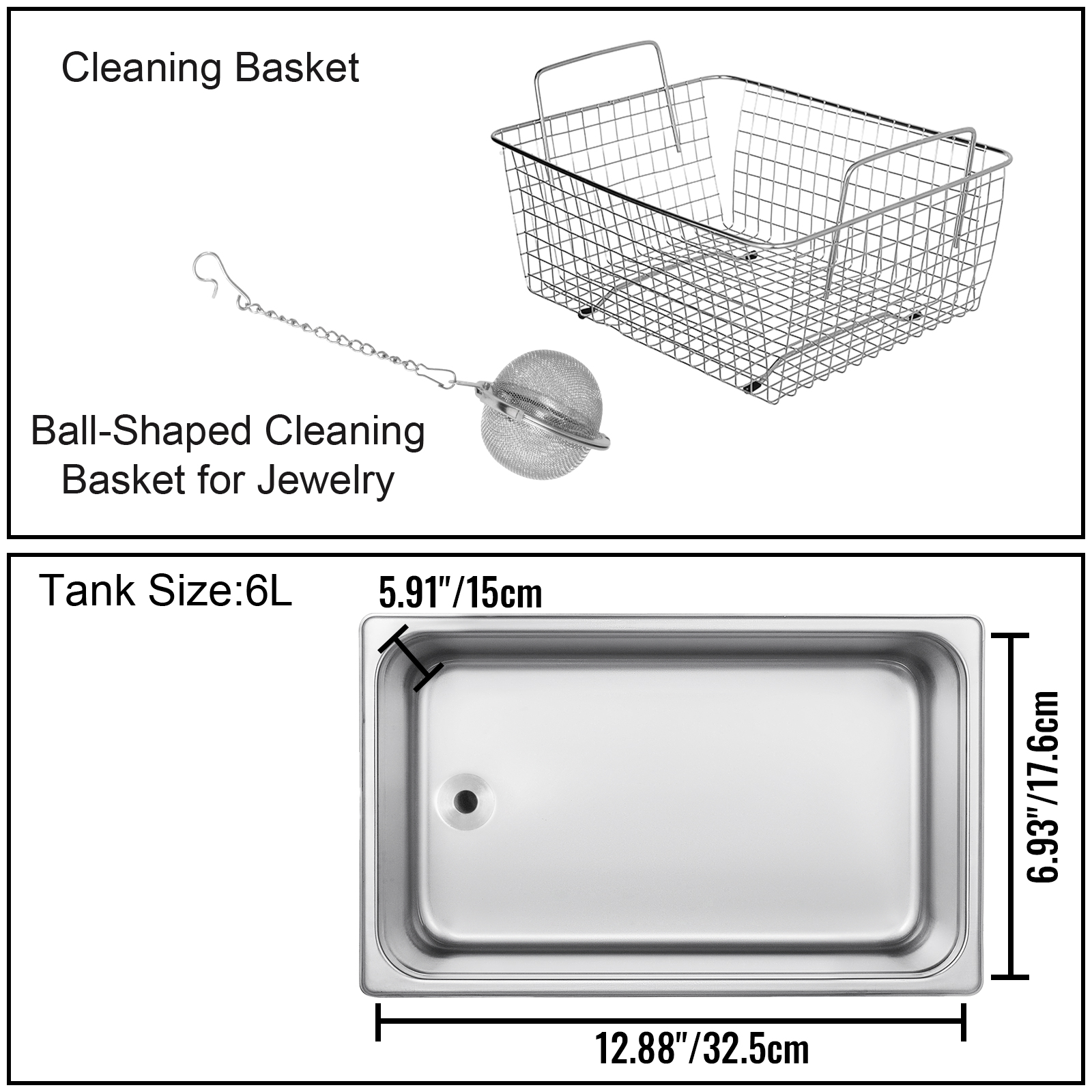 Capacità del serbatoio: 6,5L; Materiale cestino grande: acciaio inossidabile; Con un cestello per la pulizia dei gioielli a forma di palla, utilizzare l’acqua del rubinetto per la pulizia generale, inoltre è possibile aggiungere 5-10 ml di detergente nell’acqua per migliorare il risultato di lavaggio, se necessario.