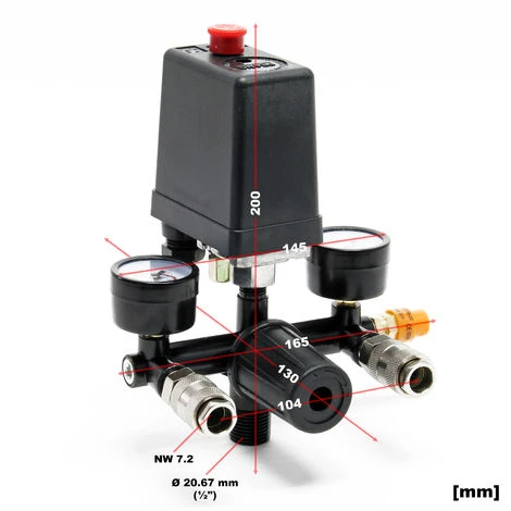 Questo set comprende: filettature esterne 20,67mm, 2 manometri e una valvola di sicurezza – un’unità completa di aria compressa con tutto quelle che serve. Il regolatore di pressione ha un manometro/display di pressione da 0 a 12 bar. La tensione di esercizio massima è di 240 Volt / 16 Amp e la pressione massima consentita è di 8 bar.