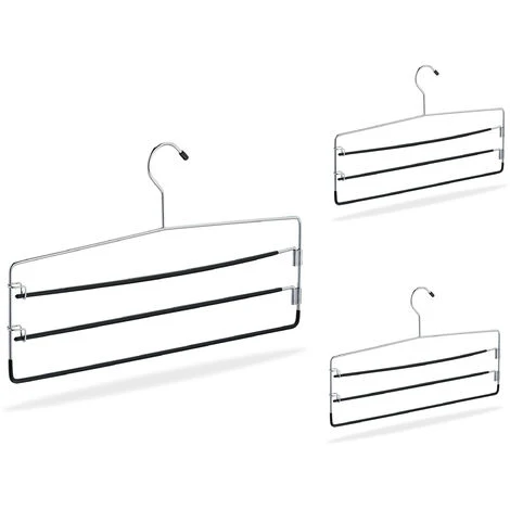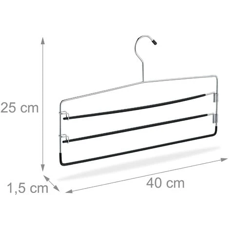 Portate ordine nel vostro armadio con queste pratiche stampelle per pantaloni in set da 3. Le grucce sono provviste di un pratico rivestimento in PVC, che impedisce ai vostri vestiti di scivolare giù. Per ogni stampella salvaspazio potete appendere contemporaneamente fino a 3 pantaloni o gonne, senza sgualcire il tessuto. Grazie alle 2 aste orientabili, prendere e appendere gli indumenti sarà un vero e proprio gioco da ragazzi! Le grucce multiple in metallo convincono con il loro design elegante e raffinato.