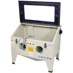 La sabbiatrice da banco SOGI S-72 è in grado di sabbiare, pulire e satinare le superfici metalliche, tramite un flusso in pressione di particelle abrasive secche, come microsfere di vetro o corindone. Nella lavorazione può presentare diversi gradi di finitura, variando la granulometria delle particelle abrasive e del tipo di particolari da lavorare, come pezzi in legno, motori, pezzi meccanici e altri metalli, plastiche etc.