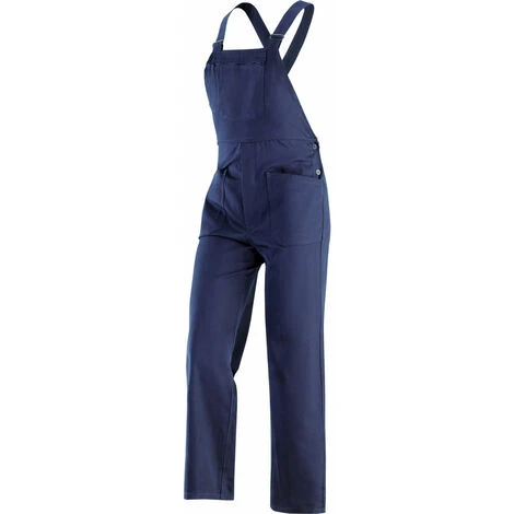 La salopette da lavoro blu ha le bretelle regolabili con fibbie in plastica, un comodo tascone chiuso con cerniera posizionato sulla pettorina, due tasche anteriori applicate e una posteriore chiusa con bottone, inoltre sulla gamba troviamo l�indispensabile portametro.