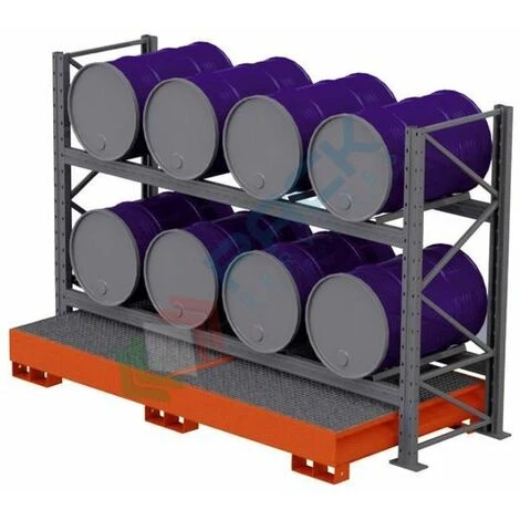 Scaffale metallico componibile ad incastro con vasca di raccolta, ideale per lo stoccaggio di 8 fusti da 200 Litri, in orizzontale su 2 livelli, Mis. vasca: 2660 L x 1060 L x 320 H mm + scaffalatura: 2900 L x 1060 P x 2000 H mm, capacità di stoccaggio 621 Litri. La vasca di contenimento abbinata alla scaffalatura, è la soluzione ideale e sicura per l’organizzazione di aree di deposito, al fine di prevenire eventuali sversamenti di sostanze pericolose ed inquinanti. Le scaffalature con vasca di raccolta sono indicate per lo stoccaggio di cisterne in sicurezza in quanto sono dotate di una vasca di contenimento inferiore che impedisce ad eventuali sversamenti di sostanze pericolose ed inquinanti di propagarsi all’interno di ambienti di lavoro o di falde acquifere. Colore arancio RAL 2004.