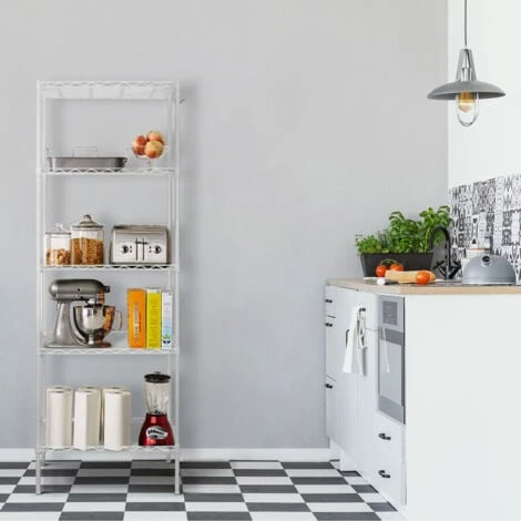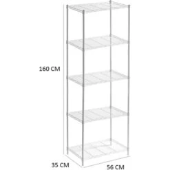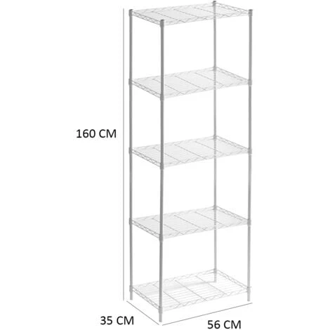 La combinazione perfetta di versatilità e resistenza! Con una struttura in metallo e una finitura cromata bianca di alta qualità, lo scaffale metallico Klaus 160 con grata è un’efficace soluzione di stoccaggio. Grazie ai 5 ripiani in metallo super resistenti, potrete riporre tutto ciò che vi serve. Il peso supportato per ripiano è di 35 kg, quindi è adatto all’uso in garage, nel ripostiglio, in cucina o in bagno. È molto facile da installare e ha un’altezza notevole per poter riporre tutto ciò che serve. È adatto sia per uso professionale che domestico e comprende ganci per appendere gli utensili. Questo prodotto è conforme alle norme di sicurezza europee, il che garantisce la qualitá del prodotto.nnCaratteristiche:n- Dimensioni: 56x35x160 cm.n- Materiale della struttura: acciaio rifinito in cromo verniciato bianco.n- Materiale del ripiano: acciaio rifinito in cromo verniciato bianco.n- Spessore della struttura: tubo 19×0,28 mm.n- Colore: bianco.n- Peso: 4,50 kg.n- Peso supportato: 175 kg in totale e 35 kg per ripiano.n- Modulare: No.n- Ruote: No.n- Arresto inferiore: sì.n- Arresti superiori: sì.n- Certificazione: CE.