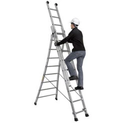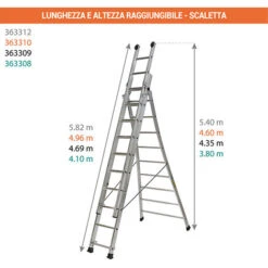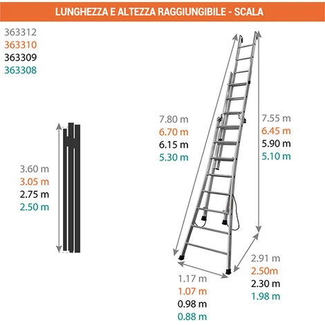 – L’altezza di lavoro massima è identica alla lunghezza della scala in posizionesemplice oppure a cavalletto aggiungendo 1 metro.