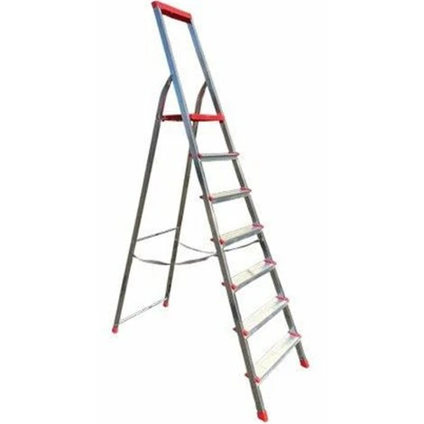 In alluminio. Dotata di vaschetta portaoggetti in plastica. Sezione montante in alluminio Mm. 40×20, sezione sostegno in alluminio Mm. 35×20. Piattaforma ergonomica in polipropilene antiscivolo con gancio di sicurezza. Gradini in alluminio estruso larghi Mm. 80. Fascia di sicurezza nelle versioni a partire da 6 gradini. Piedini antiscivolo. Portata garantita Kg. 150. Normativa europea EN 131. Certificato TUV del 14/05/2018.