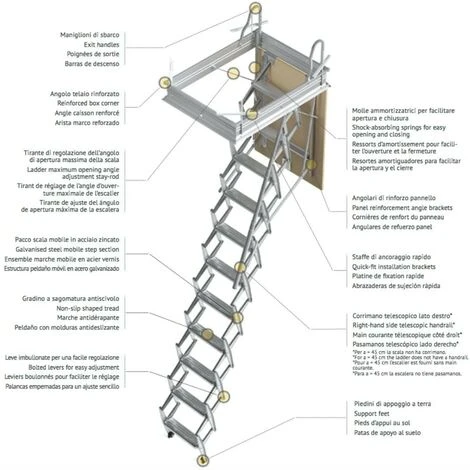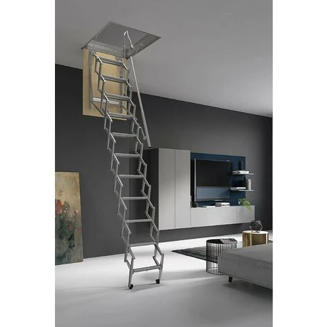 La scala retrattile a pantografo per soffitta viene spedita completamente assemblata e pronta per essere installataScala retrattile a pantografo per soffitta (11 gradini),, composta da 11 gradini, realizzata in lamiera d’acciaio stampato protetto da zincatura elettrolitica. La scala retrattile a pantografo per soffitta �� certificata secondo la normativa UNI EN 14975:2007 e garantisce una portata di 150 kg in quanto testata con carico di prova statico di 260 kg. La scala retrattile da soffitta viene spedita completamente assemblata e pronta per essere installata. Componenti utilizzati: – Struttura mobile in lamiera d’acciaio stampato 15/10 protetto da zincatura elettrolitica. – Leve imbullonate per una facile regolazione. – Telaio in lamiera di acciaio zincato 10/10 con angolari di rinforzo. – Tirante di regolazione dell’angolo di apertura massima della scala. – Staffe di ancoraggio al solaio per facilitare l’installazione della scala. – Pannello botola in legno truciolare (spessore 16 mm) con angolari di rinforzo. – Maniglioni di sbarco superiori in acciaio zincato. – Molle ammortizzatrici di richiamo per facilitare l’apertura e la chiusura della scala. – Gradino a sagomatura antiscivolo. – Corrimano telescopico lato destro. – Piedini di appoggio a terra. – Asta di manovra.
