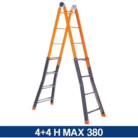 Interamente in acciaio EN131Trasformabile per usi diversi: a cavalletto compatta, zoppa, estesa in appoggio, compatta, estesa in appoggio a sfiloCerniera automatica professionale di sicurezza in acciaio zincato per apertura regolabile multiposizione