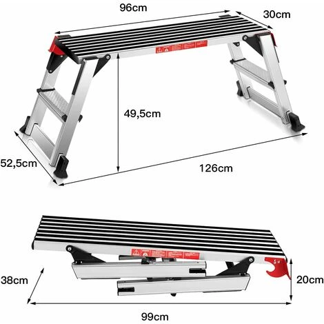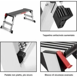 Grande piattaforma di lavoro: Questa scala da lavoro ha una superficie di 96×30 cm, quindi quando ti trovi su di essa puoi muoverti liberamente senza dover spostare ripetutamente la scala, può facilitare il tuo lavoro.