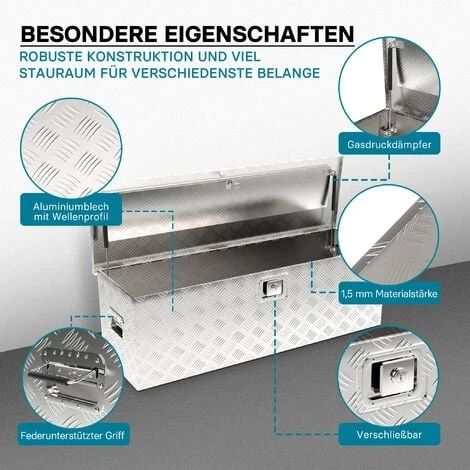 La grande cassetta porta attrezzi è realizzata in robusta lamiera di alluminio scanalata. L’alluminio è un materiale caratterizzato dal basso peso specifico e dall’alta resistenza alla corrosione. I contenitori di alluminio sono facili da pulire. Inoltre, questo materiale dona alla scatola un aspetto elegante.