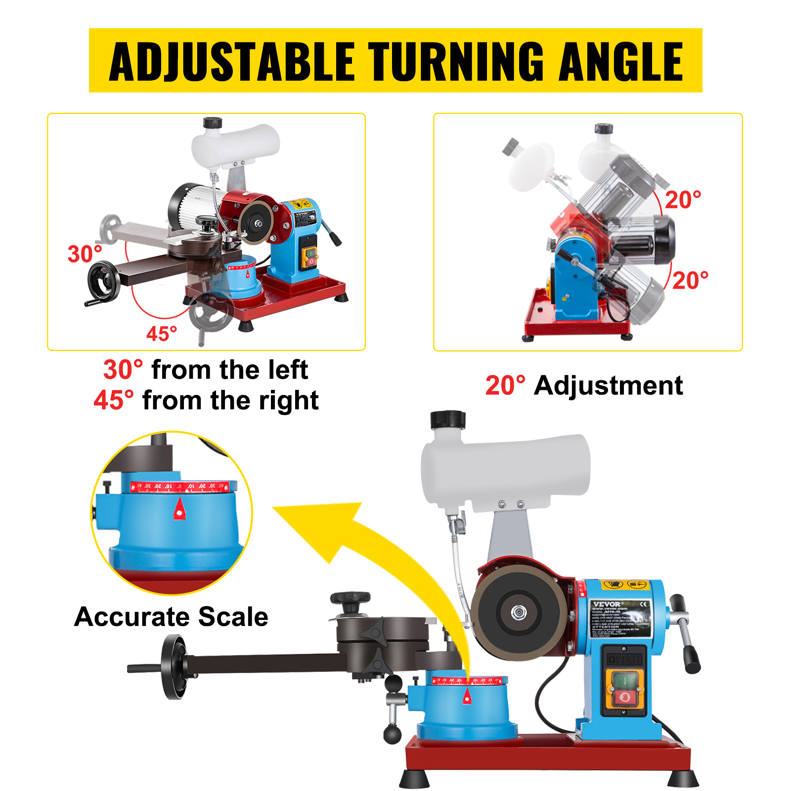 - Rettifica Precisa: La regolazione della ruota di 20 gradi rende il funzionamento più preciso e senza sforzo. È possibile ruotare la maniglia di 30° da sinistra e di 45° da destra. Due maniglie a comando manuale facilitano la regolazione dell’asse centrale e della mola e ottengono l’angolo di cui hai bisogno.