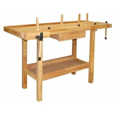 Tavolo da lavoro in legno con 2 morse fisse sul piano, cassetto centrale con guide di scorrimento in metallo, piano d’appoggio inferiore, scasso per utensili sul piano di lavoro.