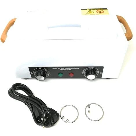 Con questo sterilizzatore professionale a secco potrete disinfettare delle attrezzature in metallo ad alta temperatura, come ad esempio gli attrezzi da manicure e pedicure, è dotato sulla parte frontale di due manopole, una è il termostato con il quale si può regolare la temperatura di sterilizzazione che può andare da 50°C a 200°C mentre l’altra manopola serve per regolare il timer da 1 a 120 minuti. Questo prodotto viene fornito senza istruzioni, l’estetica ed il colore possono variare in base alla disponibilità di magazzino, le dimensioni sono circa 36 x 20 x 20 cm, il peso è di circa 2,8 kg, la potenza è di 300 W, le due luci indicano l’accensione e lo spegnimento dell’apparecchiatura, la struttura interna è interamente in acciaio.