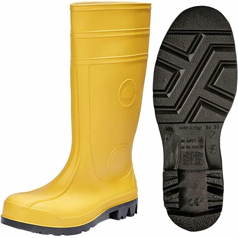 In PVC, fodera interna in maglia cotone. Puntale e suoletta in acciaio, suola grigia. A norme CE EN ISO 20345. Protezione S5.