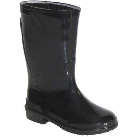 In PVC. Con fodera in tessuto di cotone, suola calandrata. Colore nero.
