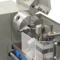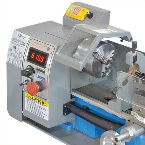 Il tornio da banco 800VPG1051 vanta un motore monofase da 0,60 kW compatto, costruttivamente semplice e particolarmente indicato per un uso hobbistico. Tale motore aziona un mandrino autocentrante a 3 griffe reversibili, supportato da due cuscinetti conici di precisione e progettato per assicurare una presa salda e sicura del pezzo da lavorare; è particolarmente indicato per il centraggio di pezzi circolari o poligonali con numero di lati divisibile per 3. Il display digitale ricavato sul carter ingranaggi mostra il valore impostato della velocità di rotazione.