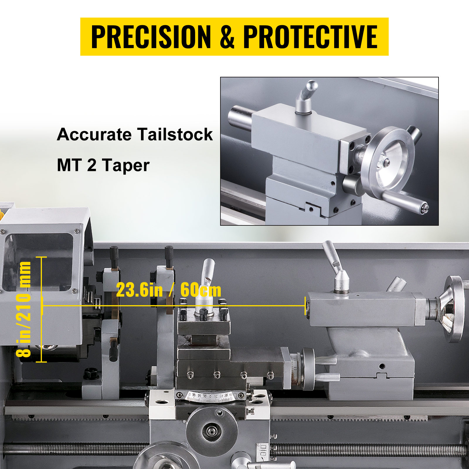 Il mini tornio in metallo di precisione da 220 x 600 mm è dotato di un motore da 750 W, un mandrino a 3 griffe, un cono mandrino MT5, un cono contropunta MT2, progettato per eseguire vari tipi di tornitura di metalli, semplice da usare. Attraverso il processo di tempra ad alta frequenza e la rettifica di precisione del letto in ghisa di alta qualità. La velocità del mandrino di 500-3000 ±10% RPM è regolabile in continuo. Riposo fisso e riposo successivo per pezzi di grandi dimensioni e/o pesanti.