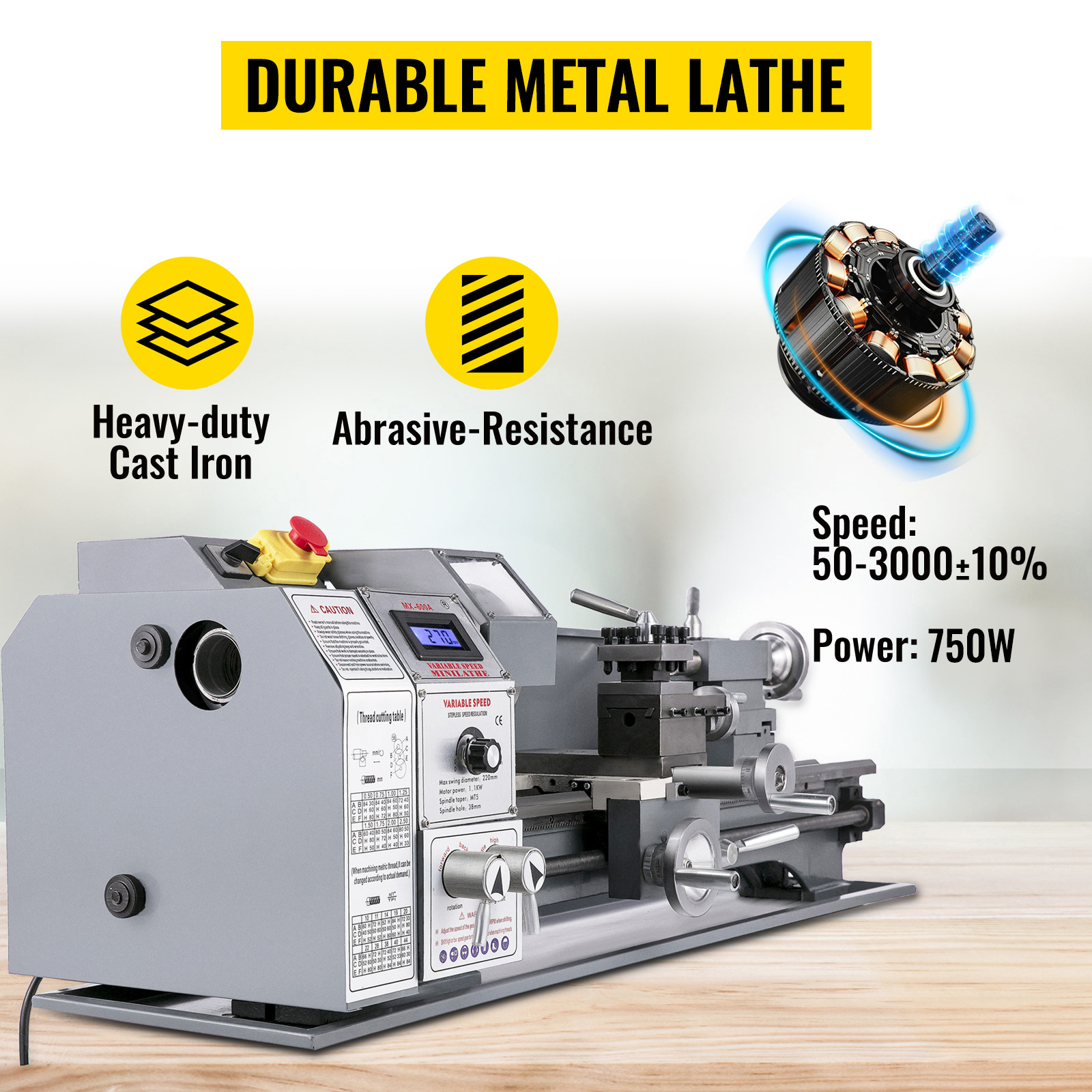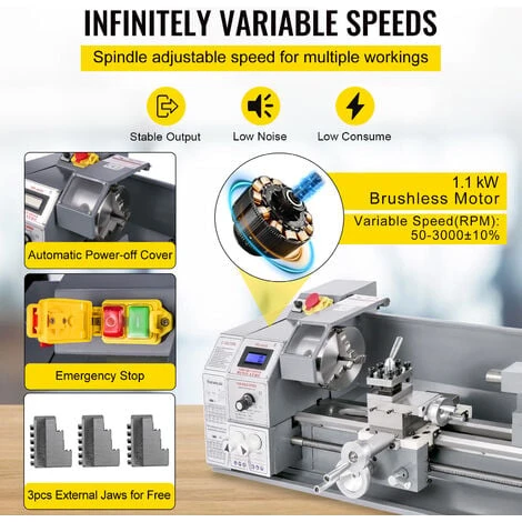 - Velocità Infinitamente Variabile: il mini tornio in metallo è azionato da un motore brushless con potenza: 750 W. Velocità variabile (giri/min): 50-3000 ± 10%. Cono nel naso del mandrino: MT5. Lo schermo a LED mostra la velocità chiara e precisa per un lavoro accurato. Soft start, commutatore per la rotazione del mandrino in senso orario o antiorario. Operare manualmente o con la velocità di avanzamento automatica regolabile.