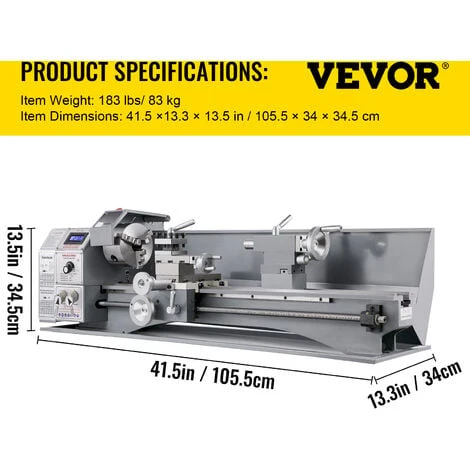 - 600 mm Ampia Gamma di Oscillazioni: il tornio da banco porta un mandrino a 3 griffe con diametro: 4,9″/125 mm. Letto oscillante: 8,7″/220 mm e Swing Over Cross Slide: 23,6″/600 mm offre più possibilità per grandi dimensioni o/e pezzi pesanti Cono nel naso del mandrino: MT5 Gamma di filettature imperiali: 8-44 TPI