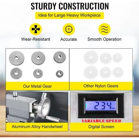 Il mini tornio ha un mandrino a 3 griffe e un foro mandrino da 1,5″/38 mm. È ampiamente utilizzato dove è richiesta una lavorazione precisa. Il montante della torretta a 4 vie sul tornio è facile da regolare. Ed è conveniente cambiare il utensili da taglio.