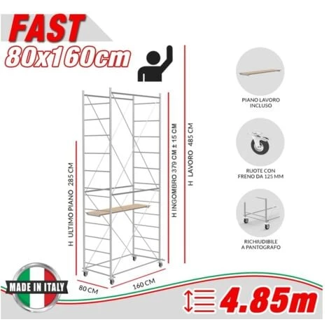 Per l’utilizzo semiprofessionale e per il fai da te. Trabattello in acciaio zincato elettrolitico ed inattaccabile dalla ruggine. Facilissimo da montare e smontare. Smontando l’asta laterale può passare attraverso porte e corridoi. Maneggevole grazie alle sue campate da 175 cm. Poco ingombrante, leggero e sicuro. Corredato di 4 ruote diametro 125 mm. I tiranti diagonali sono facilmente applicabili su appositi bussolotti alettati senza alcun uso di viti e bulloni. Completo di certificato di conformità.