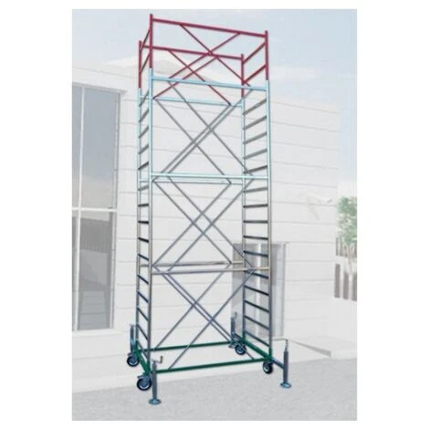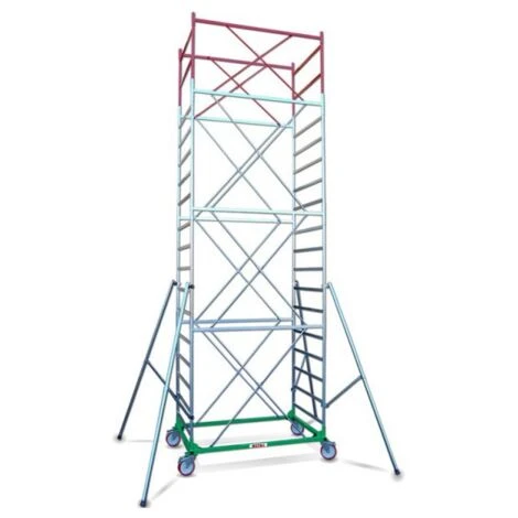 E’ costruito in ferro zincato con scalini e correnti in tubolare da 40×15 mm, piantoni da 35×1.5 e diagonali in acciaio da 20×1.5. Ha una dimensione di base 200×115 cm e un’altezza lavoro che varia da 1,90 mt a 14,30 mt.