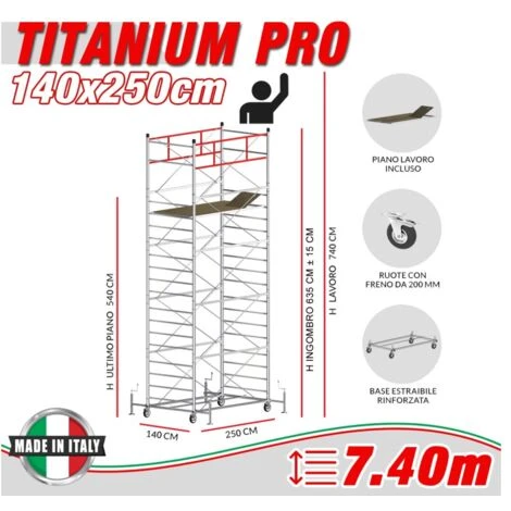 Il trabattello TITANIUM PRO è adatto per usi professionali, edilizia, manutenzioni civili ed industriali, settore elettrico. Facile da montare e smontare, è dotato di una base estraibile rinforzata in quattro pezzi ed è corredato di ruote da diametro 200 mm. Il piano di lavoro in legno è raggiungibile dall’interno attraverso una botola di passaggio. I piani di lavoro sono collocabili ogni 30 cm. I tiranti diagonali sono facilmente applicabili su appositi bussolotti alettati senza alcun uso di viti e bulloni. Il trabattello è zincato elettroliticamente e inattaccabile dalla ruggine. Completo di certificato di conformità.
