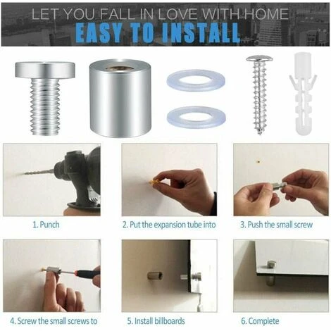 Facile da installare La vite di montaggio pubblicitaria è facile da installare. Hai solo bisogno di fissare il tubo di espansione a una parete oa una tavola di legno, quindi la parte inferiore del chiodo pubblicitario viene fissata alla parete con le viti, quindi posiziona il vetro, infine stringi le viti, tutto è perfetto.