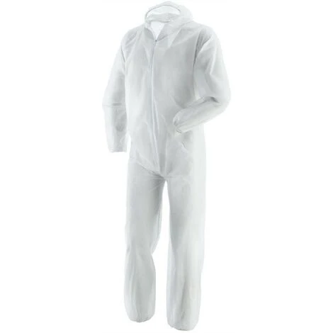 in polipropilene. Peso 40 g/mq Monouso. Ipoallergenica. Elastici senza lattice. Chiusura con cerniera. CE Ia categoria Taglia L Colore bianco