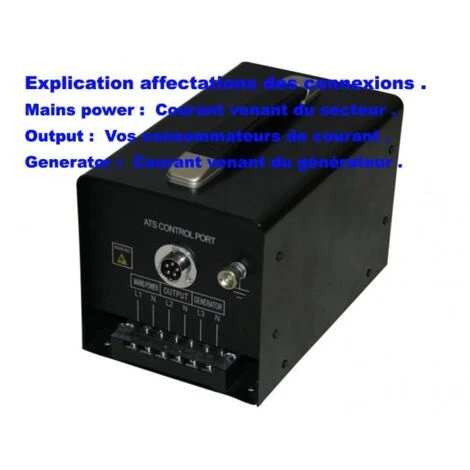 Questa scatola si collegherà al tuo gruppo elettrogeno (che deve essere compatibile e possedere la presa ATS adeguata). Avvierà il gruppo elettrogeno appena la rete elettrica sarà staccata (dopo un guasto di corrente ad esempio). Al ritorno della rete elettrica, la scatola ATS spegnerà il generatore e si trasferirà sulla rete elettrica