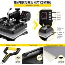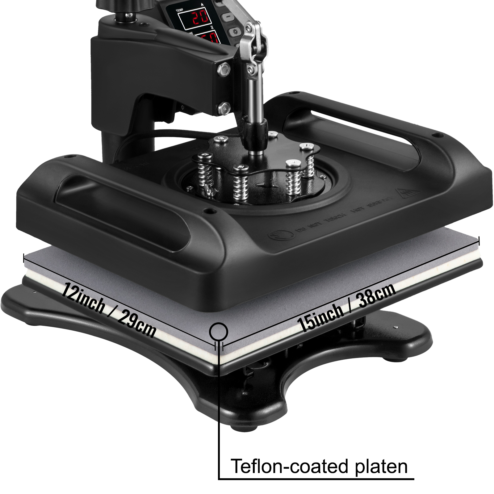 Questa macchina da stampa per magliette ha una piastra riscaldante grande 12″ x 15″ (29 x 38 cm), che fornisce una grande superficie da trasferire su oggetti a faccia piatta. La piastra rivestita in teflon è antiaderente, evitando la bruciatura dei trasferimenti.