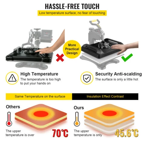 - 【PRESTAZIONI DI ALTA SICUREZZA】 – Grazie all’uso di due strati di tecnologia di isolamento, la temperatura superficiale è solo di circa 50-70 ℃, quando la temperatura di lavoro raggiunge 210 ℃. Ma la temperatura della tradizionale macchina da stampa per camicie può raggiungere i 70-100 ℃.