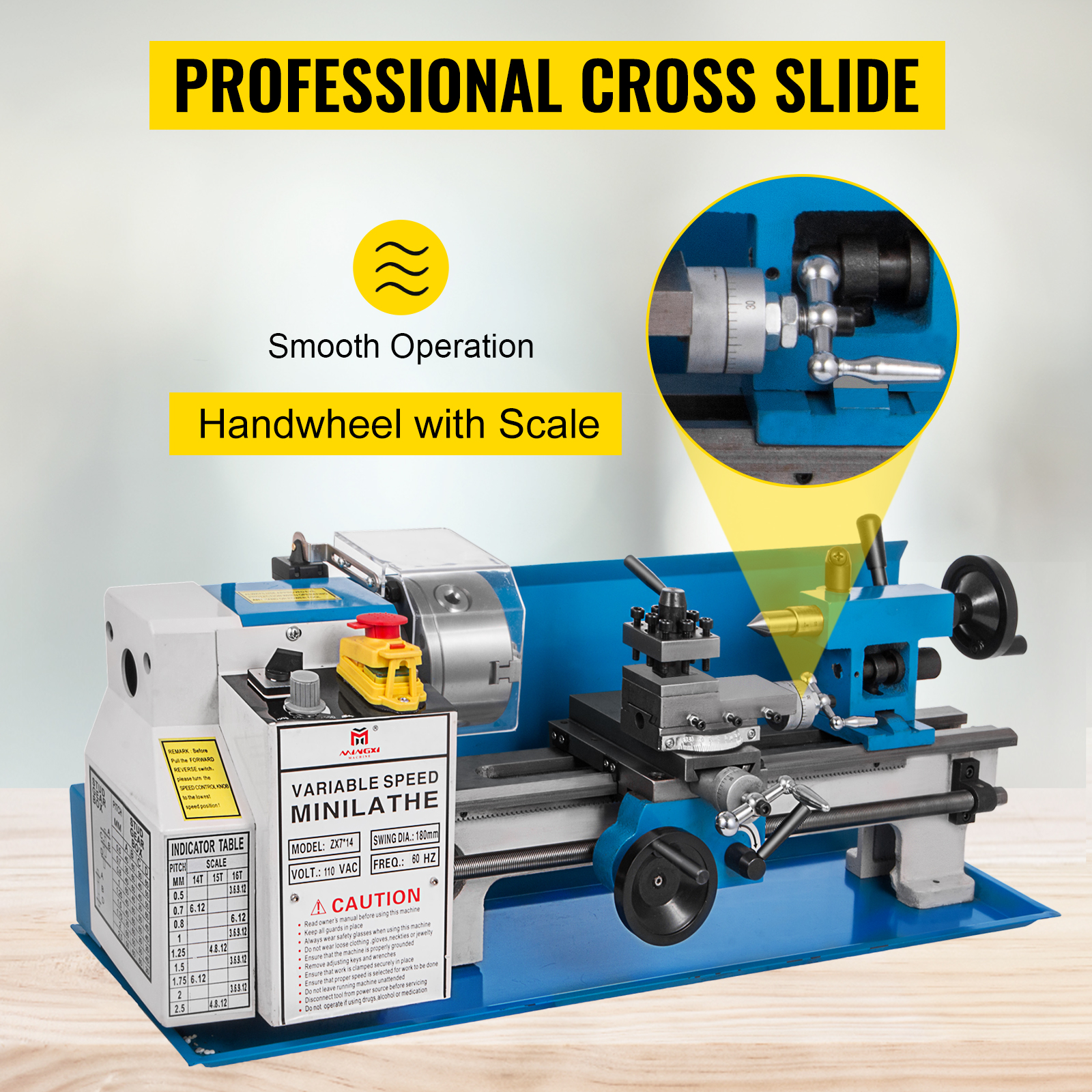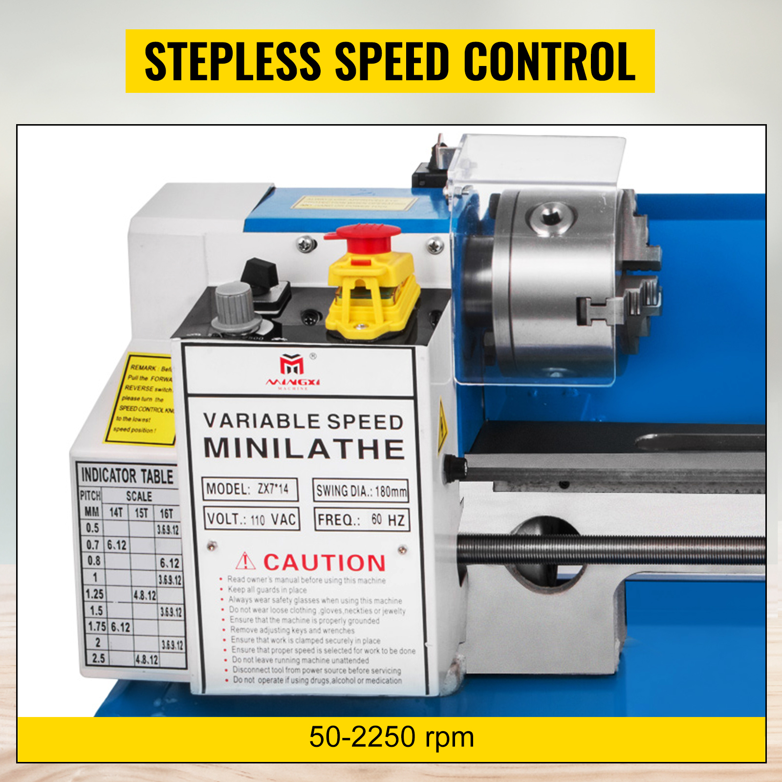 - Velocità Variabili: il tornio hanno un’ampia interasse da 350 mm e oscillazione sul letto di 180 mm, foro mandrino da 21 mm. Velocità variabile da 50-2500 giri/min. Azionare manualmente o con la velocità di avanzamento automatica regolabile. Pulsante di arresto di emergenza incluso.