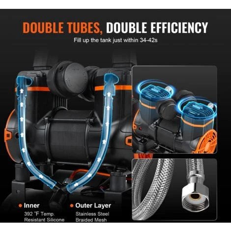 - Gonfiaggio Veloce & Efficiente: il compressore d’aria a secco adotta l’aspirazione a doppio tubo e doppio cilindro, risparmiando efficacemente tempo e fatica. Il tubo di aspirazione è realizzato in silicone resistente alle alte temperature 150℃ e rete intrecciata in acciaio inox, con doppia protezione per ridurre danni e corrosione.