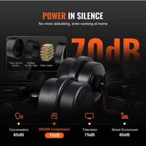 Il compressore ultra silenzioso da 70 dB funziona a basso rumore. Il filtro in cotone incorporato e il silenziatore riducono il rumore impedendo l’ingresso di polvere fine.