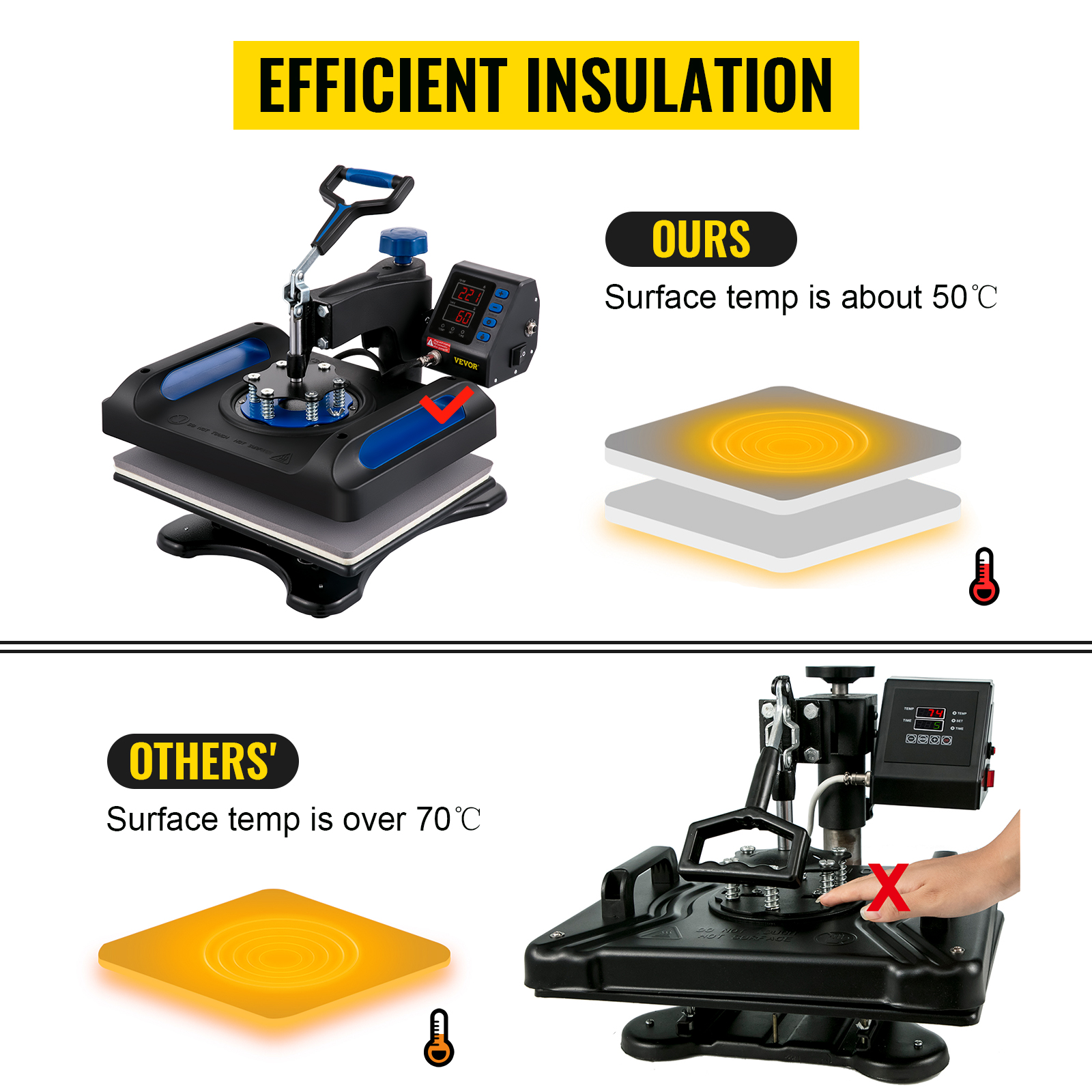 La temperatura superficiale della pressa per T-shirt è di soli 50°C circa con il nostro nuovo guscio composito e la più recente tecnologia di isolamento a due strati.